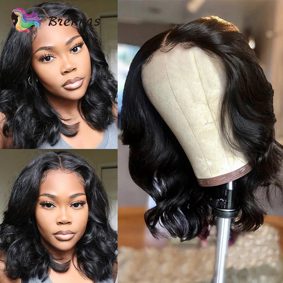 Mejor Pelucas de encaje de Brennas Official Store por Bob corto-Peluca de cabello humano ondulado de 4x4 para mujer, postizo de malla con división 13x1, pelo Remy brasileño predespuntado