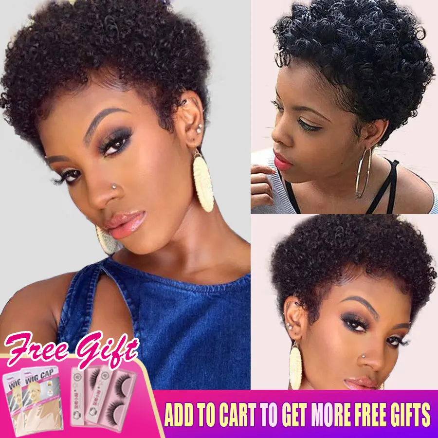 Mejores Ofertas Corte Pixie-Peluca de cabello humano Afro rizado, hecha a máquina, corta, brasileña, Remy lbQKMzro73m